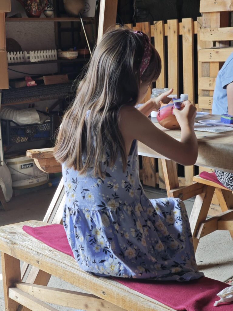 A beavatás napján, mielőtt elérkezett volna a szertartás pillanata, ebédelni tértünk be egy hangulatos lakásétterembe, ahol lehetőség nyílt kerámiát is festeni. Panka mindig is szeretett alkotni, de most olyan szépség született a keze alatt, ami még engem is meglepett: egy szivárványos kaspót festett csillagokkal és holddal. Ahogy néztem, magamban is tudatosítottam ez az alkotó tevékenység nagyon az ővé.