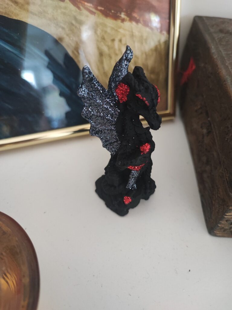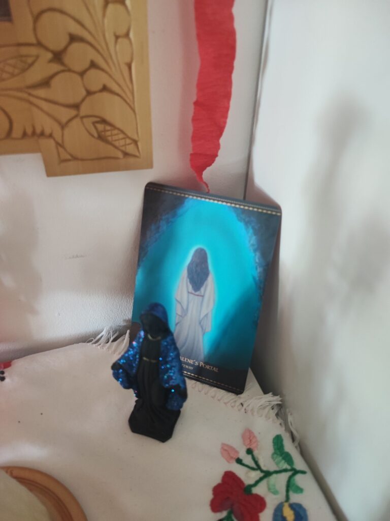 Kipakolok. Visszakerülnek az oltárokra a megmozgatott utazó kis dolgaink is, amiket magunkkal vittünk oda is oltárt építeni. Előkerül a két szobor és felteszem az első pontban hozott kártya lap mellé Tűz időszak oltáromra. Megszédülök, nem kicsit. Nézem nem hiszem el, hívom Józsit nézi nem hiszi el. Egymásra nézünk, a szoborra, a barlangra gondolunk mindketten. Pont ilyen volt. Nézem a sárkányt, Úristen Tiamat. Minden összeáll aztán mégis semmit sem értek. Kisül az agyam. Ülnöm kell egy órát a kertben. Míg rendeződök. Kicsit olvasok, ahol jártunk ott van a környék legmélyebb tengere 113 méter mély. Megtalálom a videót a barlangról. Eszembe jutnak a delfinek, a varázslatos griffmadarak amik ezen a szigeten élnek. Olvasom a kártya szövegét. Átjáró, barlang, emelkedés, az életem megváltozik … Még nem értem, az elmém meg is akadt. De tudom idő mire ezek kibontakoznak. Mi köze a törpéknek, Boldogasszonynak, Aranyasszonynak, Mária Magdolnának, Avalonnak, Tiamatnak hozzám? A barlanghoz stb. Mit jelent ez, mit hoz ez? De engedem, mert türelemmel vagyok és éber, majd kibontodik, nem sürgetem ez az én nagy kutatásom az eredettel. Az újabb magot megkaptam, a sárkányok beengedtek egy újabb beavató kapun.